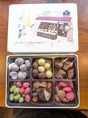 ヘーゼルナッツショコラ、ヘーゼルナッツレモン、ピスタチオフランボワーズ、ピスタチオ抹茶、アマンドショコラ、アマンドフランボワーズ、マカダミアショコラ、ドライフルーツチョコ(トマト、みかん、キウイ、パイン)、いちじくトリュフ(お酒使用しております)の詰め合わせになります。